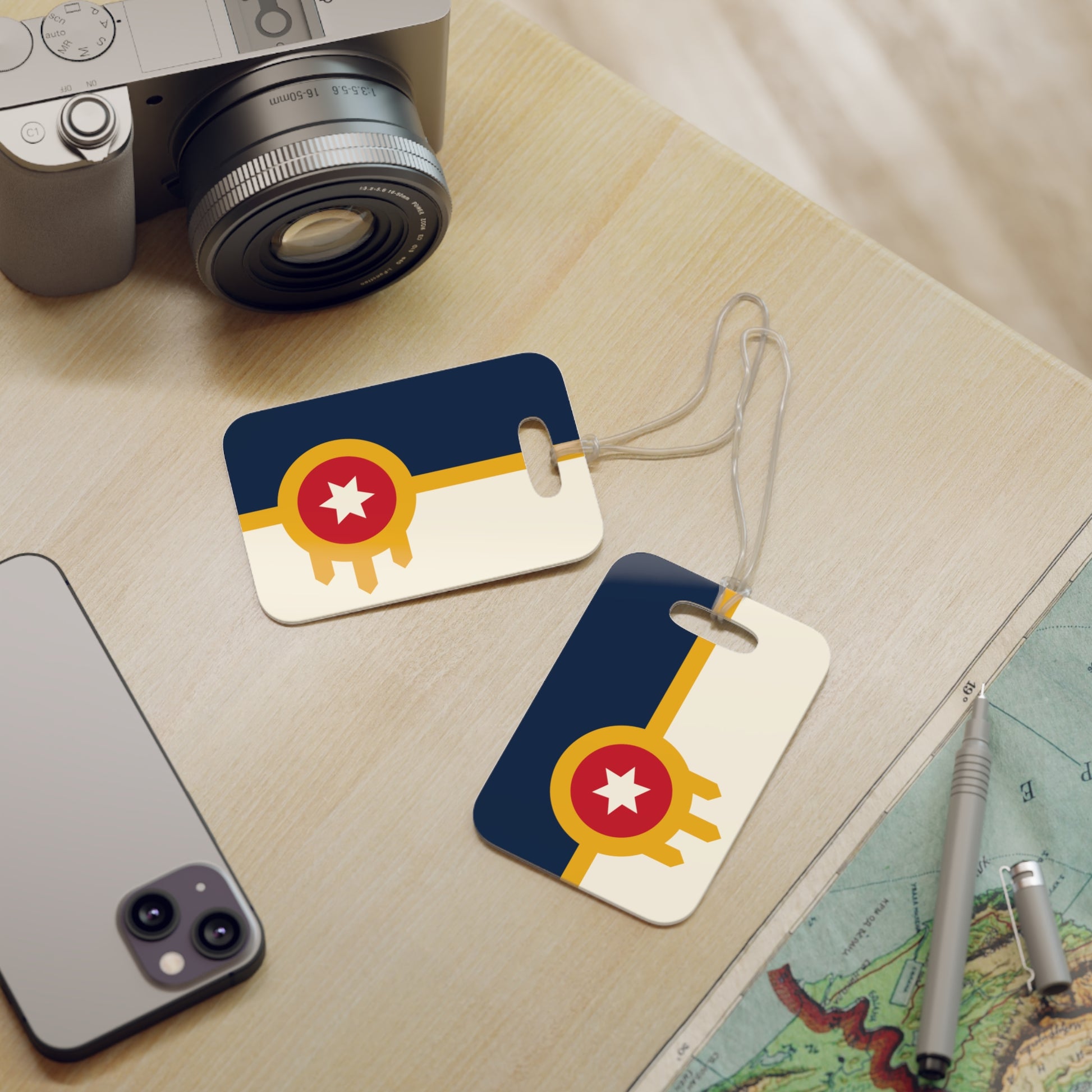 Tulsa Oklahoma-themed luggage tags designed for suitcases and carry-ons, featuring TUL airport code and vibrant colors. Perfect for travelers heading to or from Tulsa, Oklahoma, or for those who simply appreciate unique luggage tags.